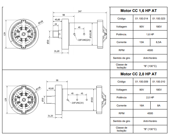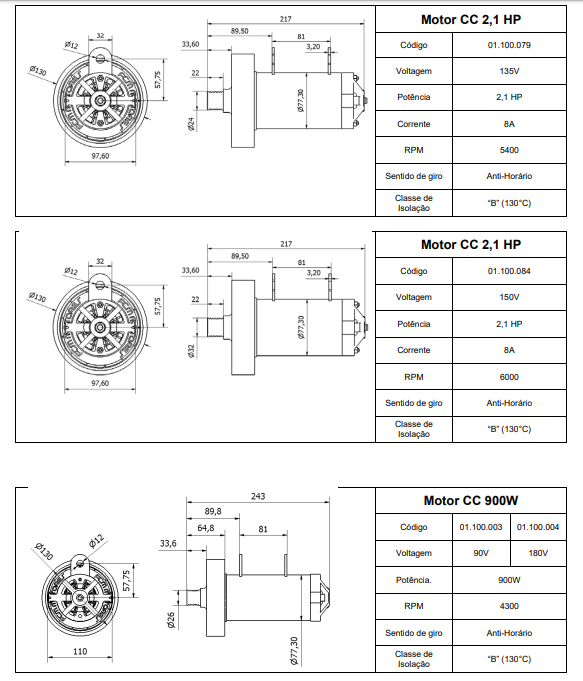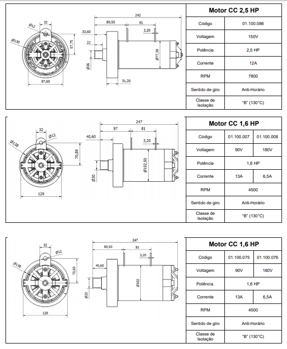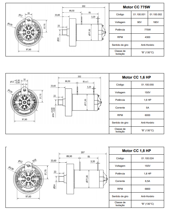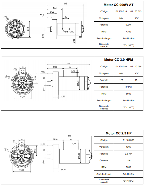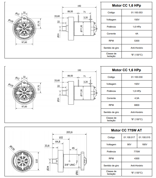 Motores usados em equipamentos da linha fitness, como esteiras e outros modelos elétricos. Temos modelos com diversos tipos de voltagens, que vão de 90V a 180V. A potência dos nossos motores para a linha fitness varia de 775W a 3HPM. Todos os modelos operam no sentido anti-horário. Entre as opções há motores que variam de 4.300 a 7.800 RPM. Fabricação própria, tecnologia de ponta, garantia de qualidade, material de primeira linha.